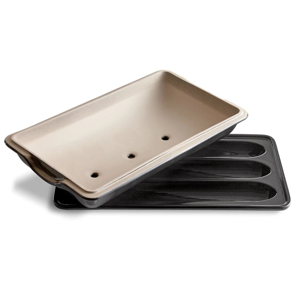 Entdecken Sie das Vergnügen, selbst drei knusprige Baguettes in der Emile Henry Baguette Backform zu backen. Dank der gerippten Kerben kleben die Baguettes nicht an die Form an. Der Deckel erlaubt, die richtige Feuchtigkeitsrate zu erstellen, die notwendig ist, um Brot im Ofen zu backen. Die Löcher im Deckel ermöglichen eine dünne und knusprige Kruste – charakteristisch für gute französische Baguettes. Alle Emile Henry Produkte sind in Frankreich hergestellt.