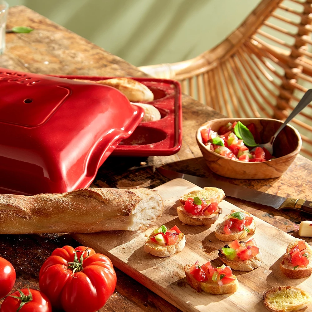 Entdecken Sie das Vergnügen, selbst drei knusprige Baguettes in der Emile Henry Baguette Backform zu backen. Dank der gerippten Kerben kleben die Baguettes nicht an die Form an. Der Deckel erlaubt, die richtige Feuchtigkeitsrate zu erstellen, die notwendig ist, um Brot im Ofen zu backen. Die Löcher im Deckel ermöglichen eine dünne und knusprige Kruste – charakteristisch für gute französische Baguettes. Alle Emile Henry Produkte sind in Frankreich hergestellt und 10 Jahre garantiert .