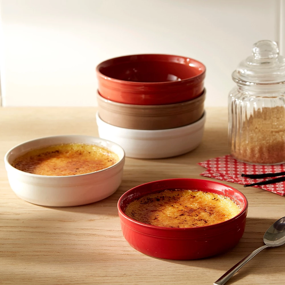Die bunten Crème brûlée-Formen von Emile Henry haben eine ebene Oberfläche und einen Durchmesser von 12 cm, der für den Einsatz eines Brenners oder eines runden Heizstabs ideal ist. Unabhängig davon, ob es sich um eine Crème brûlée mit Ziegenkäse oder ein Tomaten-Mozzarella-Crumble als Vorspeise oder eine traditionelle Crème brûlée zum Dessert handelt, Ihre Zubereitungen werden immer gelingen. Die Förmchen sind flach, so dass sich die Hitze gleichmäßig verteilen kann, und für Platzgewinn im Kühlschrank problemlos stapelbar. Ihre gleichmäßige Hitzeverteilung ist das Geheimnis gelungener Crème Brûlées – sogar ohne das sonst übliche Wasserbad. Sie eignet sich auch für individuelle Portionen von Kuchen oder Quiche – oder einfach als Dessert- oder Salatschale.