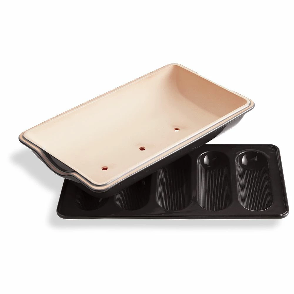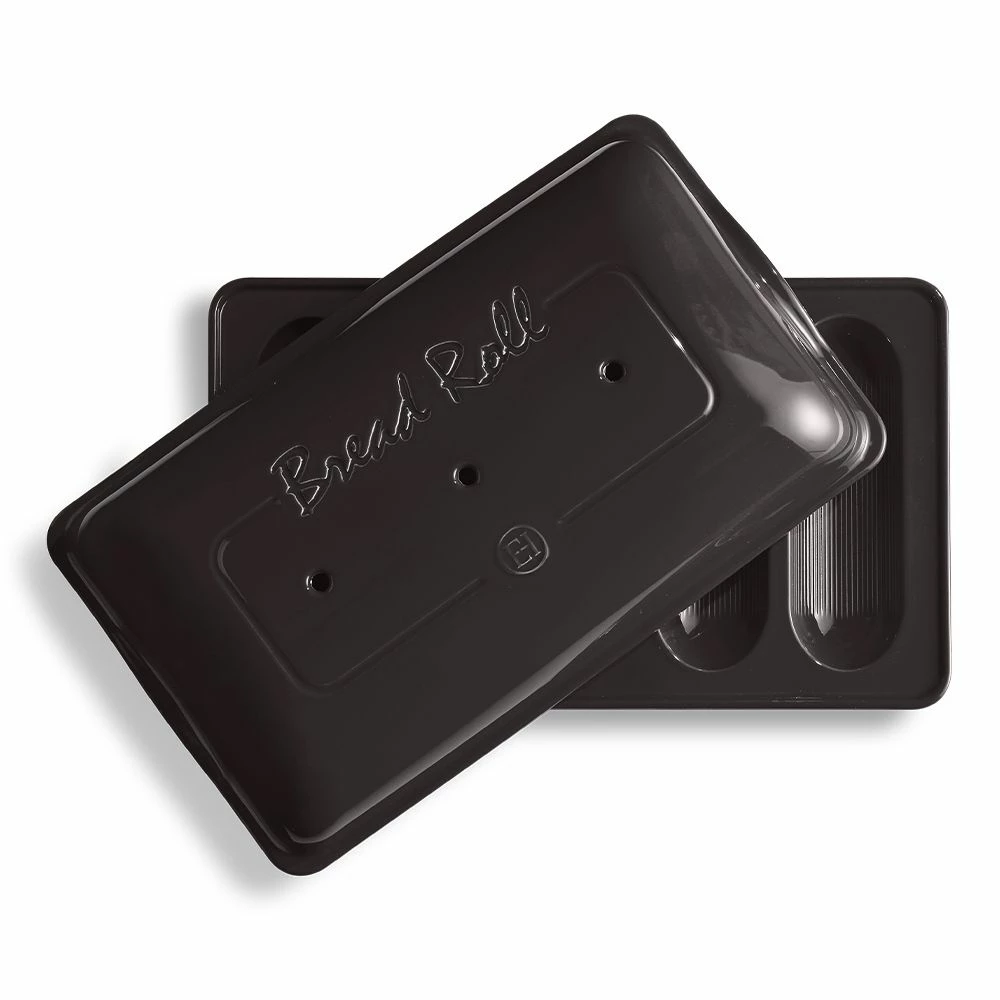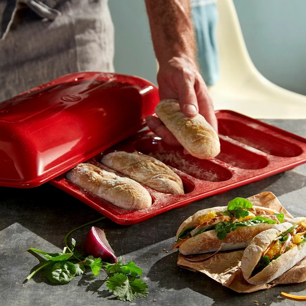 Brotbackform für 5 Mini Baguettes. Der gewölbte Deckel hilft, die Feuchtigkeit zu kontrollieren und die ideale Konsistenz zu gewährleisten. Die ofenfeste Keramik und die Löcher im Deckel sorgen für den Feuchtigkeitsgehalt während der Backzeit – die Kruste wird knusprig und die Krume weich.
