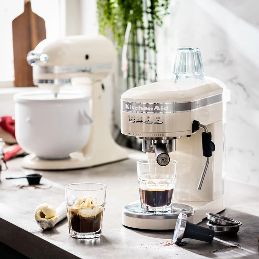 Die Espressomaschine von KitchenAid erweckt die Kunst der Espressozubereitung zu Hause zum Leben. Sie können authentische Espresso-Shots sowie beliebte Getränke auf Espresso-Basis wie Latte, Cappuccino, Macchiato, Café Americano, Flat White und sogar Affogato (mit Eiscreme) zaubern. Alle werden vorbeikommen und sich diese kompakte und elegante Espressomaschine mit Metallgehäuse ansehen wollen. Dank der zwei intelligenten Temperatursensoren, der italienischen Pumpe mit 15 bar und Vorinfusion können Sie einen vollmundigen, aromatischen Espresso mit Crema zubereiten. Fühlen Sie sich mit dem Siebträger aus Edelstahl, dessen flacher Boden gleichmäßiges und stabiles Tampern ermöglicht, wie ein Profi. Einfacher oder doppelter Espresso? Wählen Sie ganz einfach mit einem einzigen Knopfdruck.