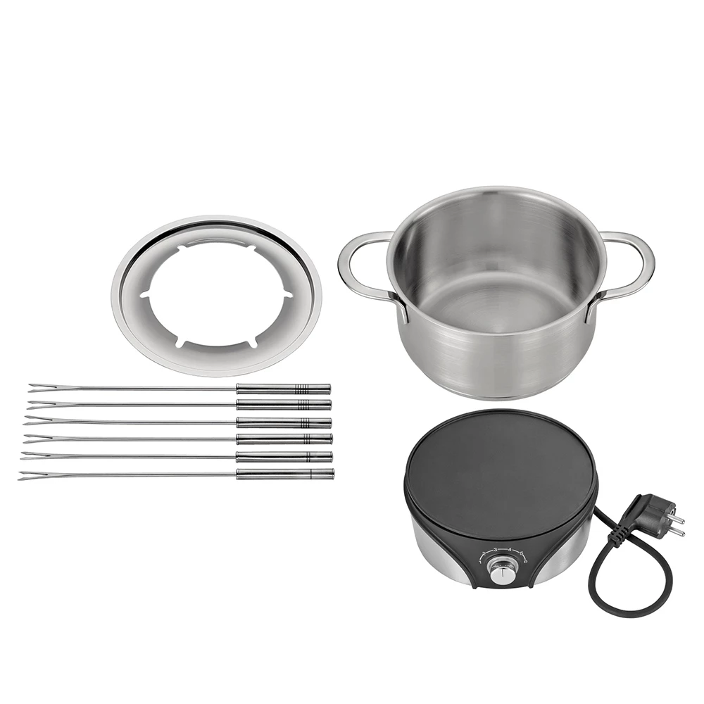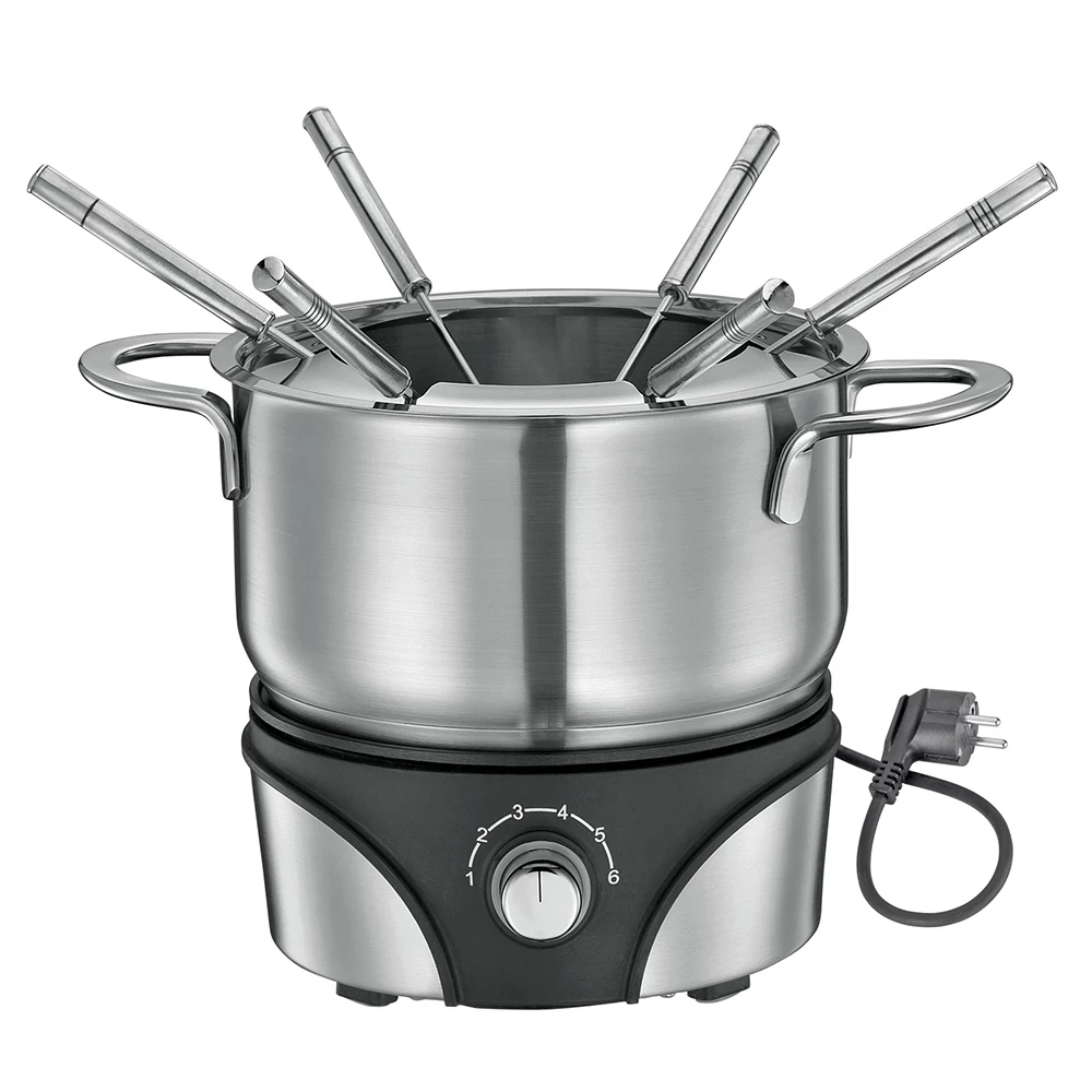- Bestehend aus: Fondue-Topf mit Spritzschutz, Rechaud (50°C – 210°C), 6 Fleischfonduegabeln