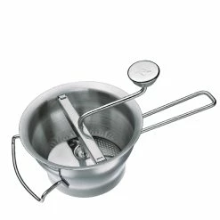 Herausgekommen ist die perfekte Verbindung von Funktion und Design. Das Gerät aus solidem Edelstahl liegt gut in der Hand, die Kurbel mit dem großen Knauf lässt sich leicht drehen. Bei drei Passierscheiben und einer Reibscheibe zum Passieren von Lebensmitteln mit harter Schale wie Äpfel oder Tomaten bleiben keine Wünsche offen. Tomatensuppe, Apfelmus, Kartoffelpüree oder Fruchtgelee kommen frisch auf den Tisch.
