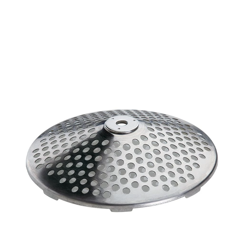 - Mit vier Scheiben aus Edelstahl (grob 5 mm, mittel 3 mm, fein 2,5 mm und extra-fein 1,3 mm)