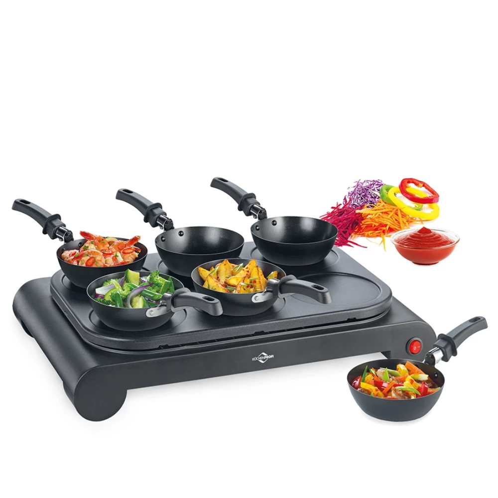 brutzeln neben dem knackigen Brokkoli mit Bohnen und wie schmeckt wohl das Hühnerfilet in süß-saurer Sauce? Sie haben den ganzen Abend Zeit, es herauszufinden und auf kulinarische Entdeckungsreise zu gehen. Die antihaftbeschichteten Wokpfännchen stehen sicher in Vertiefungen auf der Heizplatte und bleiben lange warm. Beim Brunch-Buffet wartet das robuste Gerät mit Crêpes, Pancakes oder Spiegeleiern auf. Let’s party!