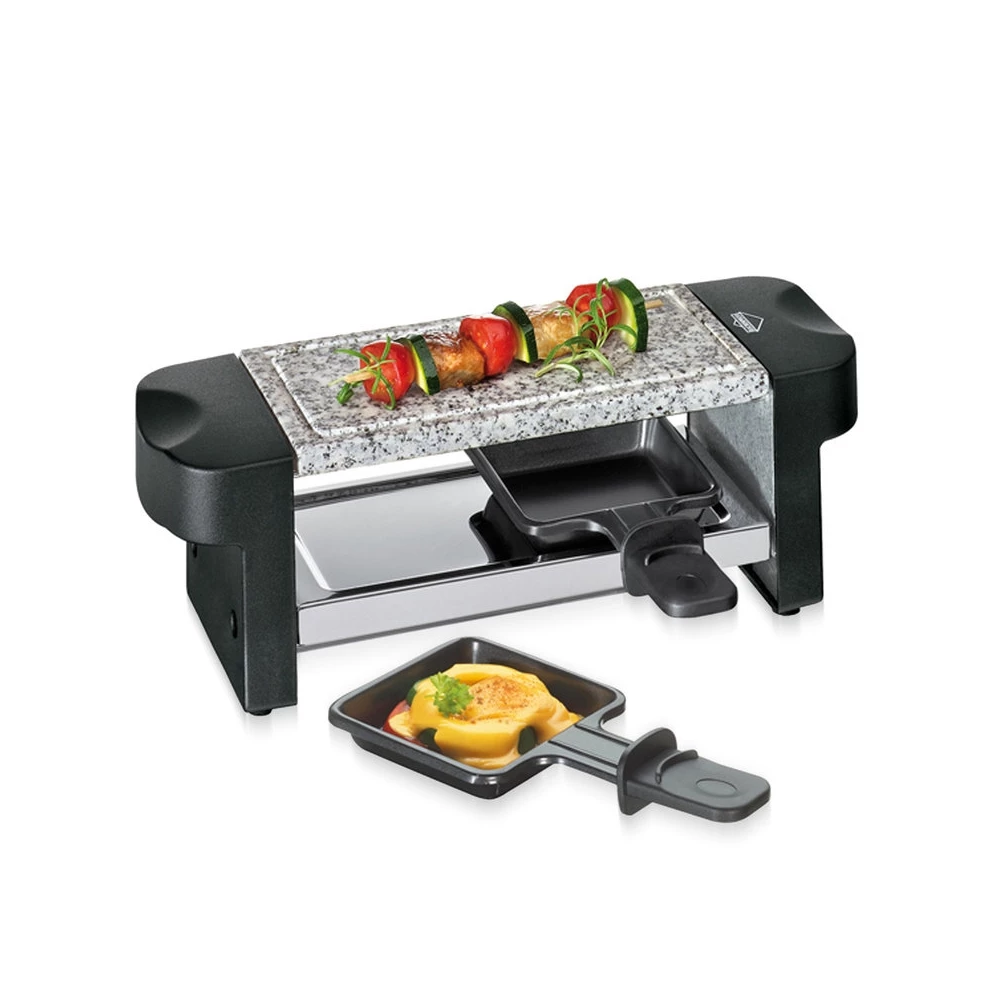 Endlich Feierabend! Jetzt ist die Zeit gekommen, um bei einem gemütlichen Abendessen einen Gang herunterzuschalten. Mit dabei: das Raclette HOT STONE DUO von KÜCHENPROFI. Das kompakte Gerät ist ideal für spontanen Genuss. Es ist schnell aufgebaut und nimmt auf dem Tisch kaum Platz weg. Kartoffeln, Mixed Pickles und Dips bringen Sie noch locker unter. Während Sie mit dem Partner, einer Freundin oder ganz für sich alleine den Tag ausklingen lassen, schmilzt der Raclette-Käse goldgelb in den beiden Pfännchen. Die Pfännchen sind antihaftbeschichtet, damit der köstliche Inhalt mühelos auf den Teller gleitet, und haben hitzebeständige Griffe. Zum Grillen kommt der heiße Stein zum Einsatz. Er ist ideal für Kurzgebratenes wie Steak, Schnitzel, Medaillons, Frühstücksspeck oder Mini-Frikadellen. Auch Spezialitäten aus dem Meer wie Scampi oder Lachsspießchen gelingen im Nu. Wer es vegetarisch mag, legt in Scheiben oder Streifen geschnittenes Gemüse auf die Platte. Und bei frischen, mit Zucker bestreuten Obststücken zum Dessert greifen alle gerne zu.