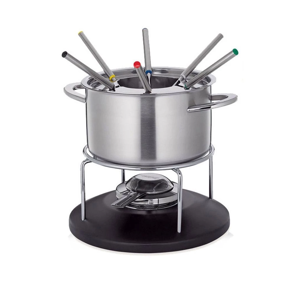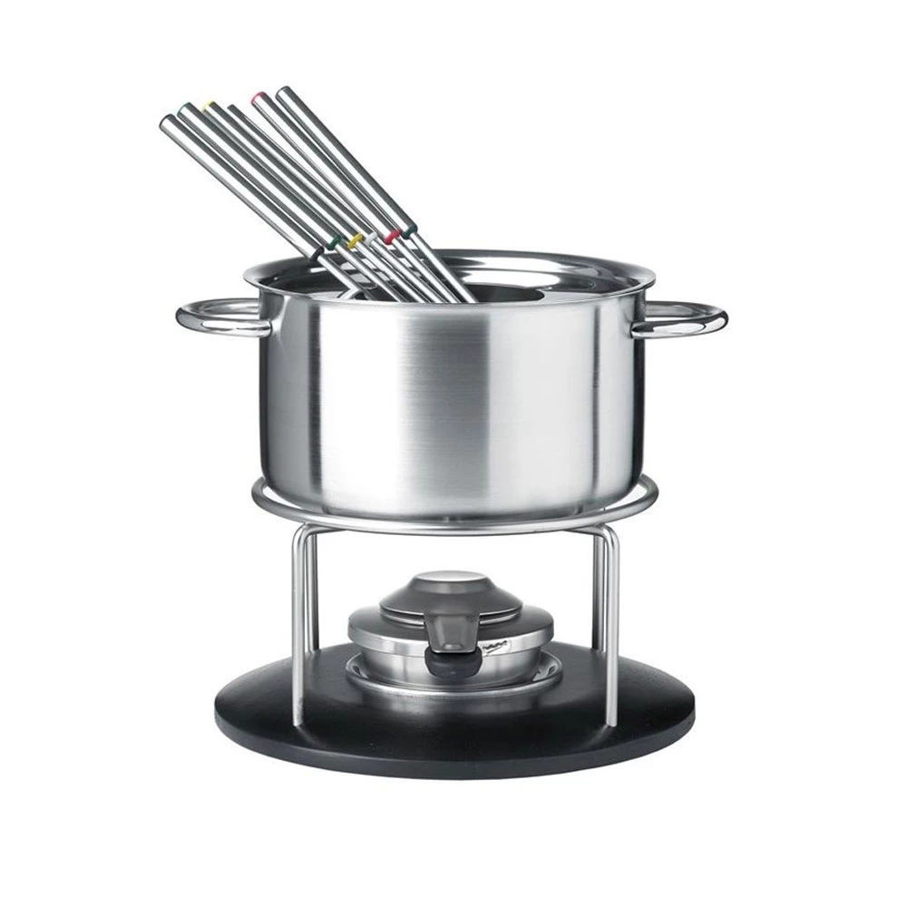 Induktionstauglicher Fondue-Topf inkl. Spritzschutz aus gebürstetem Edelstahl. Das Rechaudgestell ist verchromt und das Unterteil besteht je nach Ausführung aus schwarzem oder rot lackiertem Holz. Im Set enthalten ist ebenfalls der Pastenbrenner aus Edelstahl und 6 Edelstahlgabeln mit Edelstahlgriff, bzw. mit rotem Kunststoffgriff.