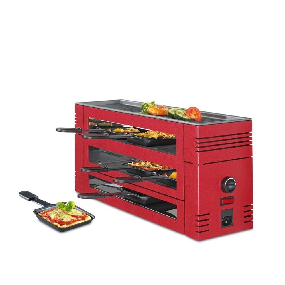 Das Pizza Raclette Gerät ist für bis zu 6 Personen. Die hochwertige Grillplatte aus Aluminium-Guss ist antihaftbeschichtet und abnehmbar. In dem Gerät befinden sich 3 leistungsstarke Heizspiralen für zügiges Back-, Raclette- und Grillvergnügen. Diese lassen sich mit einem Schalter An- und Ausschalten oder stufenlos regulieren. Die unterste Ebene dient als Abstellfläche für nicht benutzte Pfännchen. Das Gehäuse ist aus Aluminium-Guss, pulverbeschichtet und in der Farben weiß, schwarz und rot erhältlich. Im Lieferumfang enthalten sind.