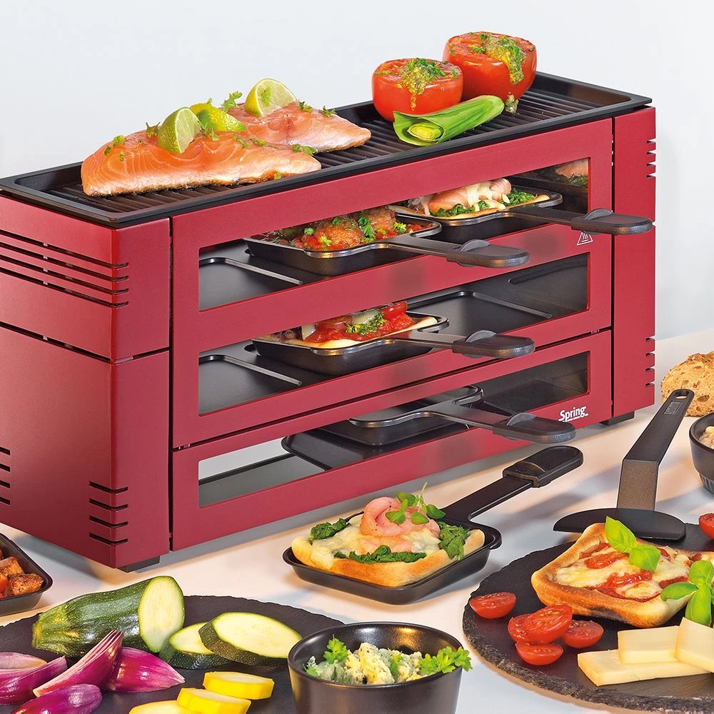 Geselligkeit hat einen neuen Namen: Raclette-6. Genießen Sie mit Freunden, Familie und Kindern. Ob knusprige Pizza wie beim Italiener, vergnügliches Raclettes oder gegrillte Fisch-, Fleisch- oder Gemüsespezialitäten auf der antihaftbeschichteten Grillplatte. Alles ist möglich – Die Party liebt Spring.
