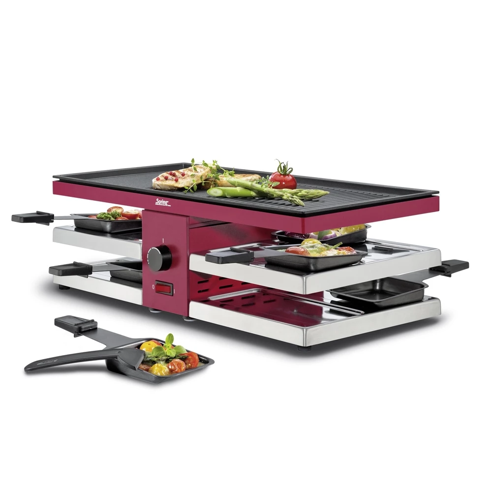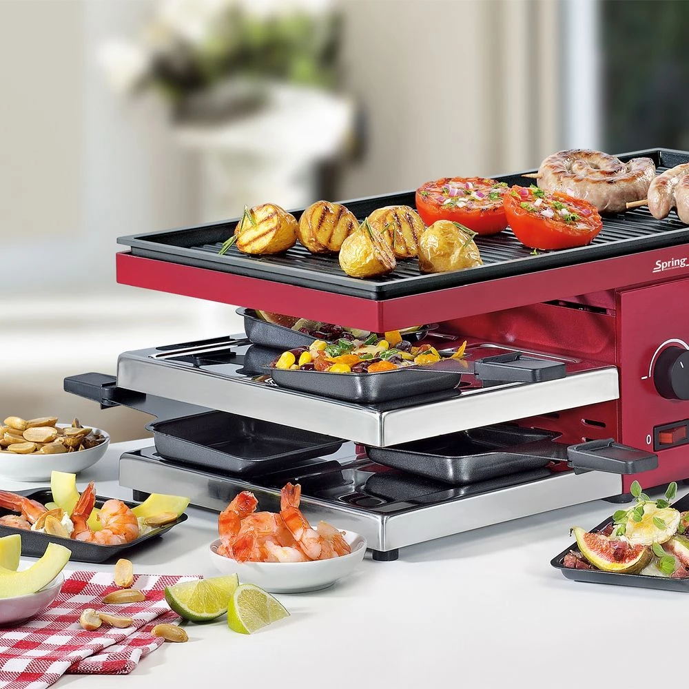 Geselligkeit hat einen neuen Namen: Raclette 8 Fun. Genießen Sie mit Freunden, Familie und Kindern. Ob knusprige Pizza wie beim Italiener, vergnügliches Raclettes oder gegrillte Fisch-, Fleisch- oder Gemüsespezialitäten auf der antihaftbeschichteten Grillplatte. Alles ist möglich – Die Party liebt Spring.
